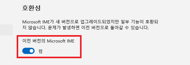 입력기 트레이 아이콘 우클릭 -> [설정] -> [이전 버전의 Microsoft IME] 설정